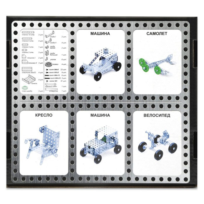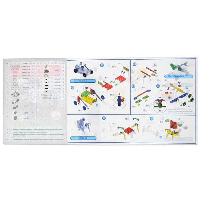 В наборе колеса, планки, ключи, скобы. Приводится схема сборки 5-ти моделей (2-х машинок, велосипеда, самолета, кресла).