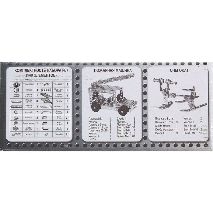 В наборе уголки, колеса, ключи, скобы, планки, пластины. Приводится схема сборки 2-х типовых моделей (пожарной машины и снегоката). Возможно создание других моделей.