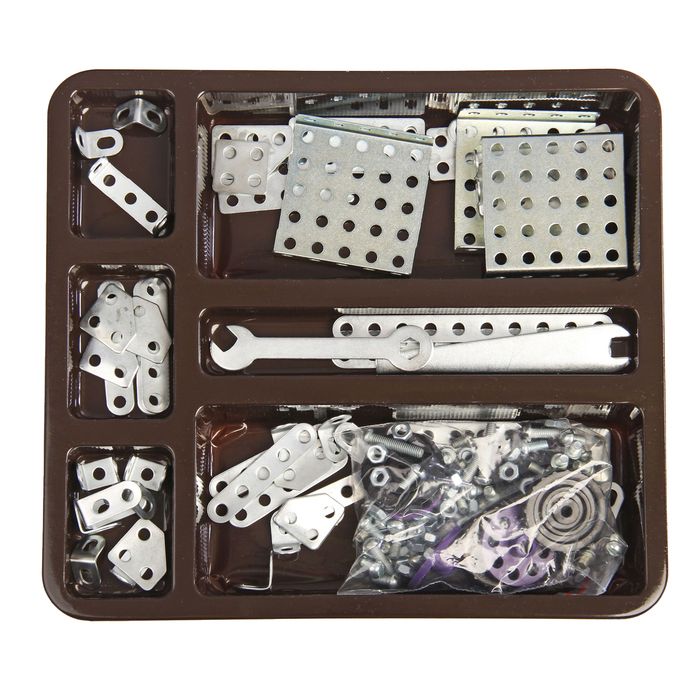 В наборе косынки, колеса, скобы, ключи, пластины. Приводится схема сборки 5-ти моделей (машина, самолет, коляска, велосипед, вертолет).