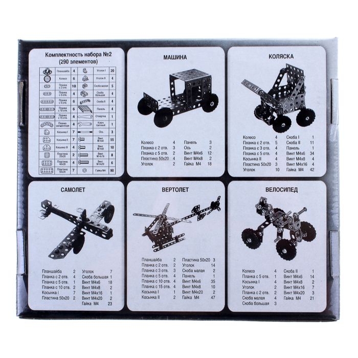 В наборе планки, пластины, косынки. Приводится схема сборки 5-ти моделей (машина, коляска, самолет, велосипед, вертолет).