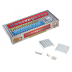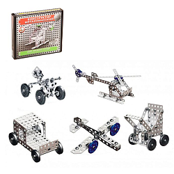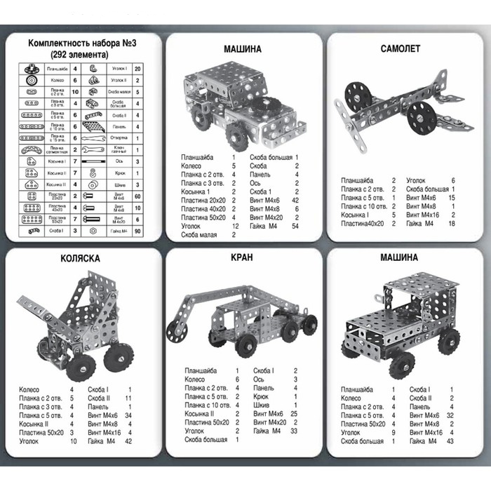 В наборе шкивы, крюки, гайки, винты, планки, пластины. Приводится схема сборки 5-ти моделей (2 машины, коляска, самолет, кран).