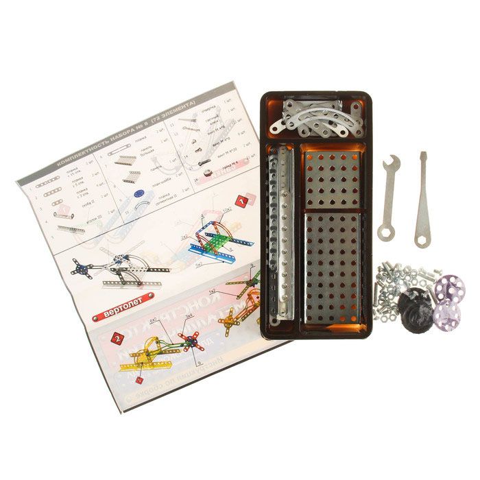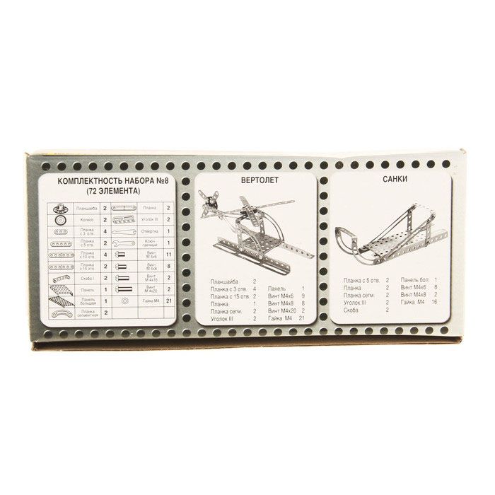 В наборе металлические панели, планки, скобы, гайки, уголки, винты. Схема сборки 2-х базовых моделей приводится на упаковке. Дошкольники и младшие школьники получают возможность самостоятельно собрать макеты вертолета и санок.