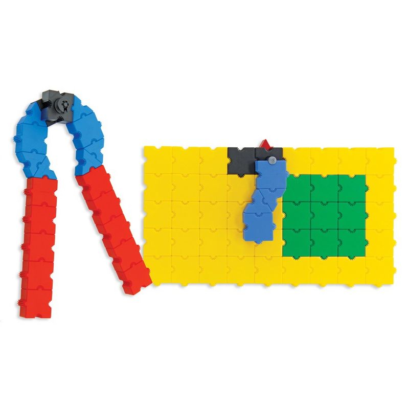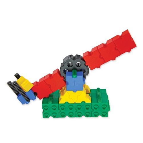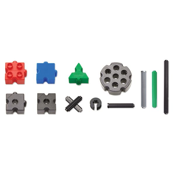Набор для развития навыков математического мышления представлен шестеренками, треугольными и квадратными деталями, соединительными элементами, из которых при помощи 40-ка рабочих карточек выстраиваются модели объектов (транспорт, полигоны, качели, иные сооружения).