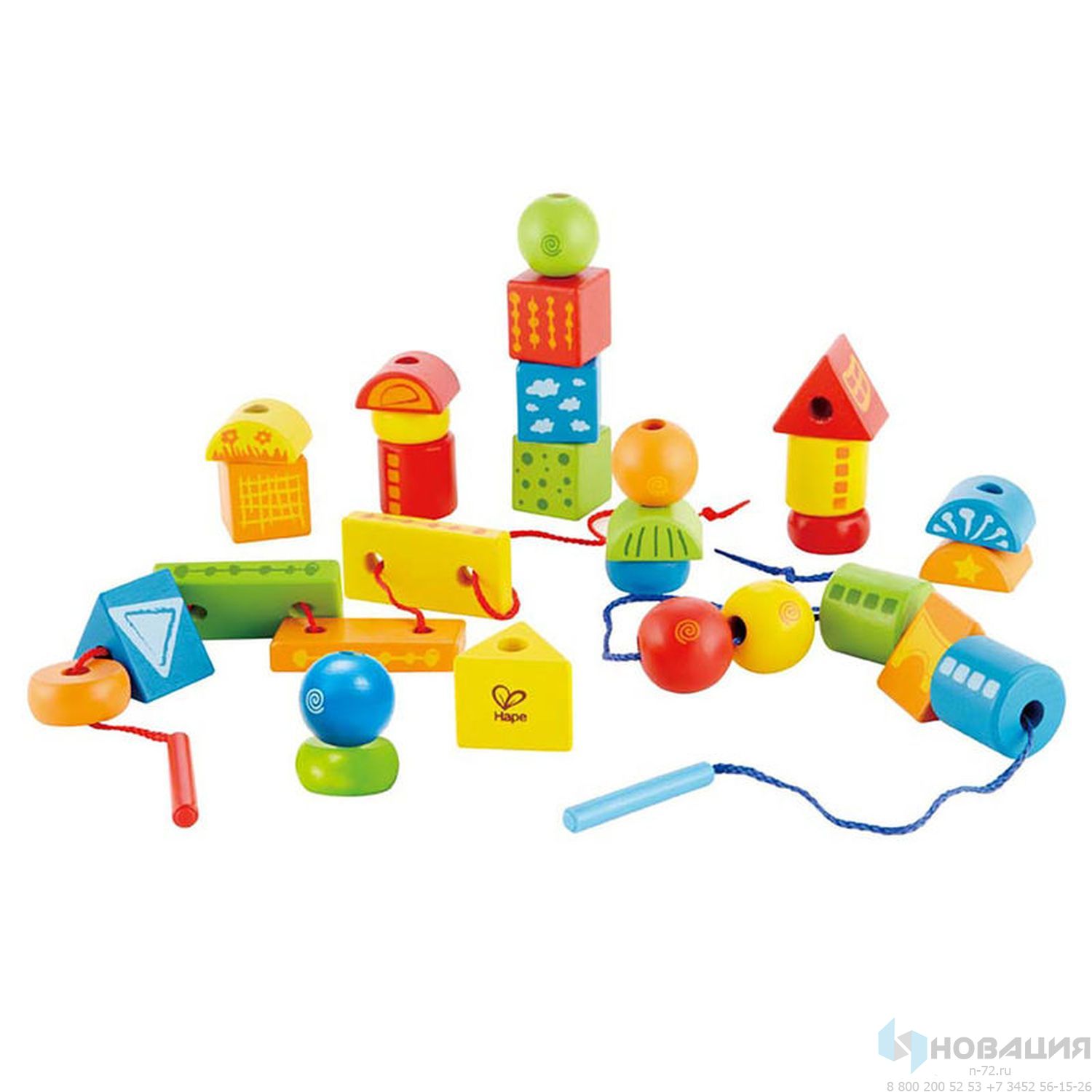 Конструктор состоит из нити и 32 деревянных блоков, различных по цвету и форме. Элементы легко нанизываются на шнурок, и дети могут создавать большое количество комбинаций.