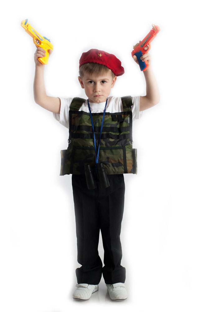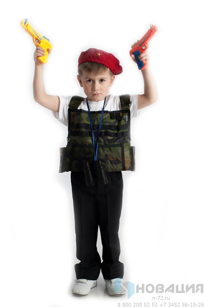 В комплект входят имитация бронежилета и красный берет со звездой. Жилет крепится при помощи регулировок и липучек, оснащен карманами и петлями для реквизита. Берет регулируется посредством фиксатора и шляпной резинки.