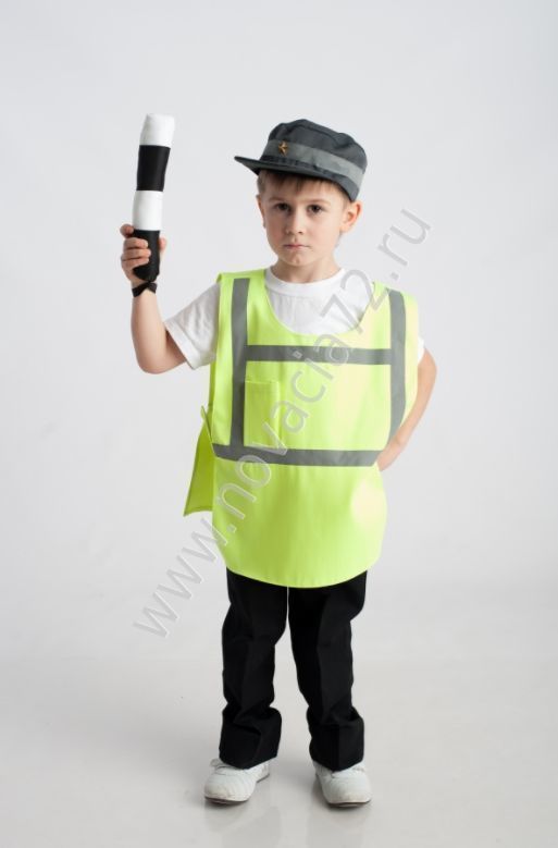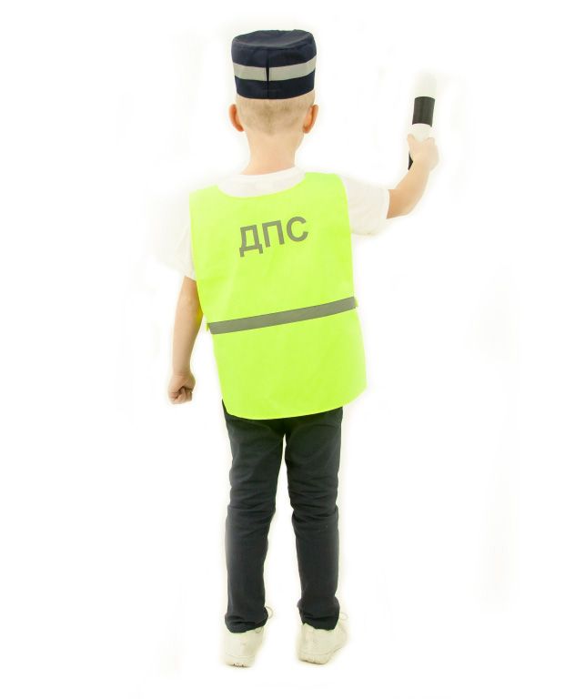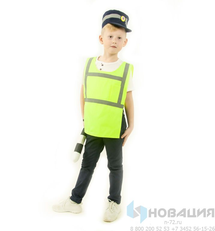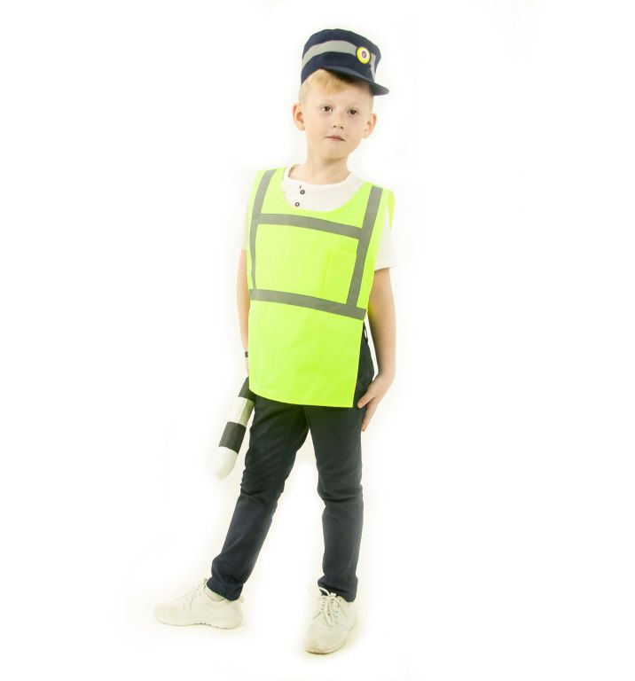 В комплекте жилет на застежке-липучке с карманом на груди, кепи с козырьком и кокардой и жезл. На кепи и жилете есть светоотражающие полосы.