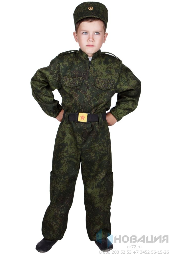 Костюм выполнен в стиле милитари. Комбинезон с карманами на груди и штанинах застегивается на молнию, перетягивается ремнем. Низ рукавов и штанин собран на резинку. Кепи с обтянутым тканью козырьком фиксируется при помощи резинки.