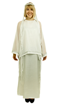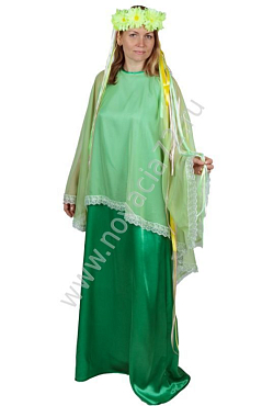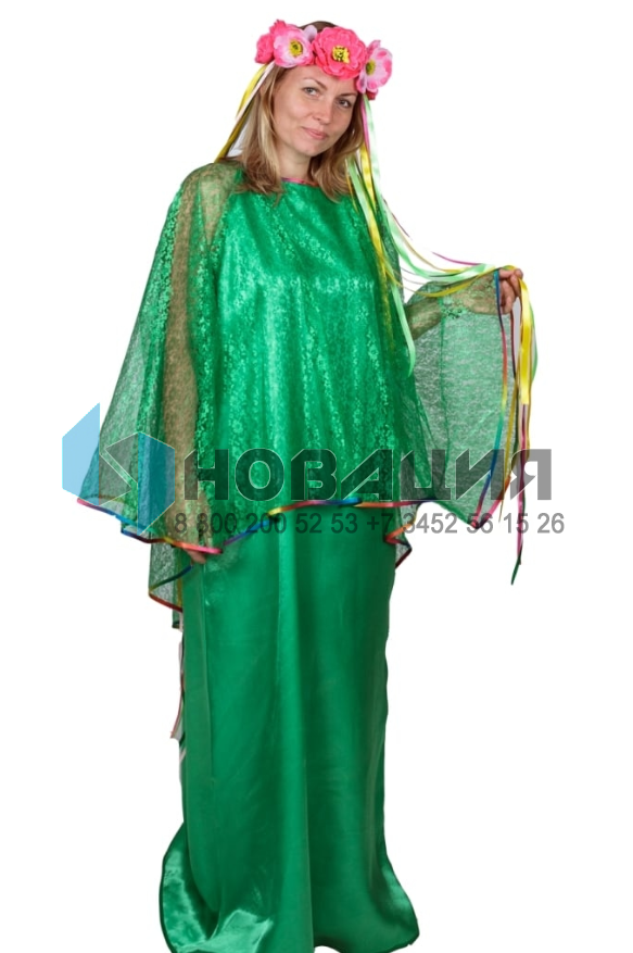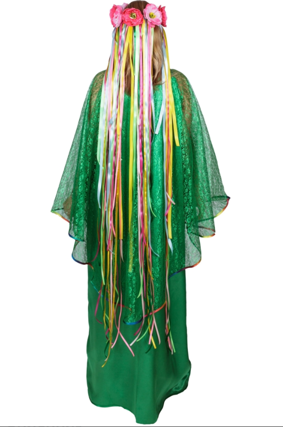 Костюм включает в себя длинное платье изумрудного цвета и головной убор в виде венка из искусственных цветов, украшенного длинными атласными лентами. Верхняя накидка платья окаймлена разноцветной лентой.