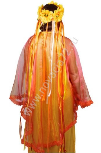 Костюм состоит из длинного платья золотистого цвета и венка из искусственных цветов и лент.