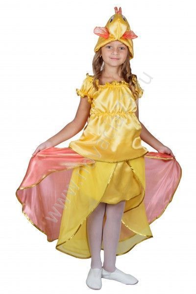 Костюм представлен шапкой в виде золотой рыбки с длинным хвостом, топом и юбкой, удлиненной сзади.
