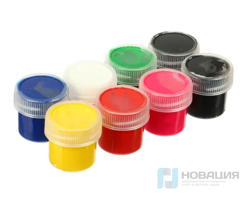 В картонной коробке 8 прозрачных баночек из пластика с красками разных цветов (по 1 цвету). Материал пригоден для рисования по стеклу, картону, бумаге.