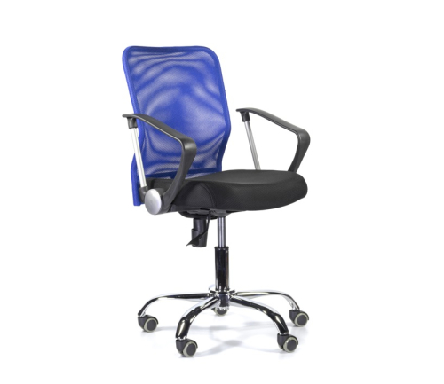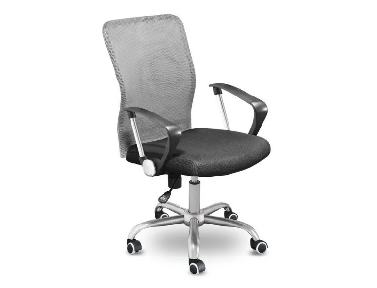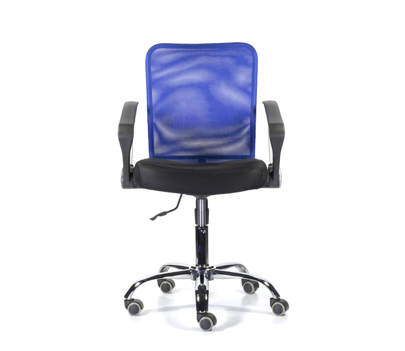 Удвоенное сиденье обшито износостойкой тканью. Спинка со внутренней поддержкой поясницы отделана тканью-сеткой. Подлокотники пластиковые с алюминиевыми вставками, хромированный газ-лифт. Пятилучье оборудуется колесами с полиуретановым покрытием.