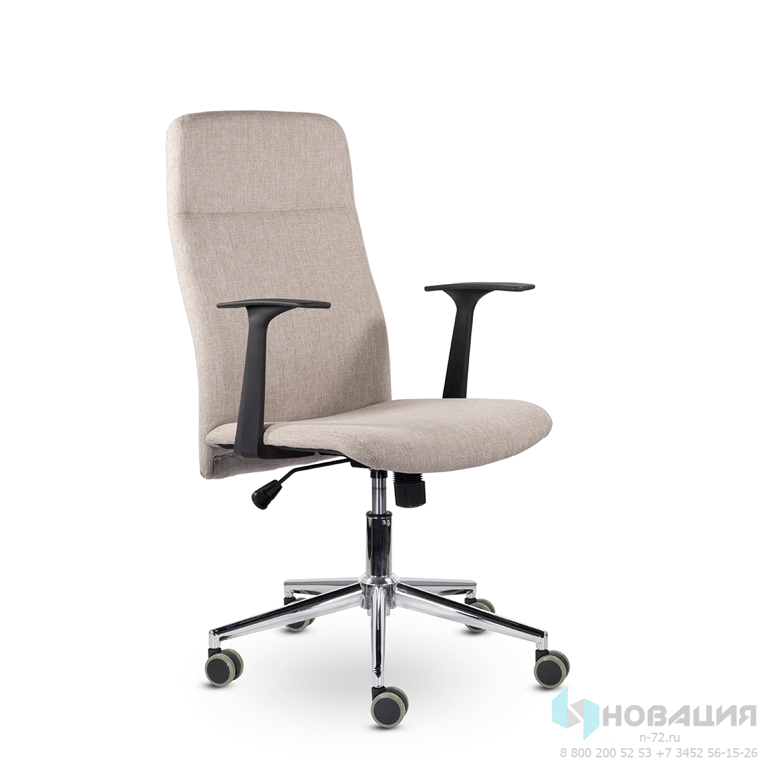 Мебель оснащается Т-образными подлокотниками и механизмом качания. Высота кресла изменяется. Пятилучье оснащается колесами d 50 мм, покрытие полиуретановое. Сиденье и широкая спинка обиты износостойкой тканью.