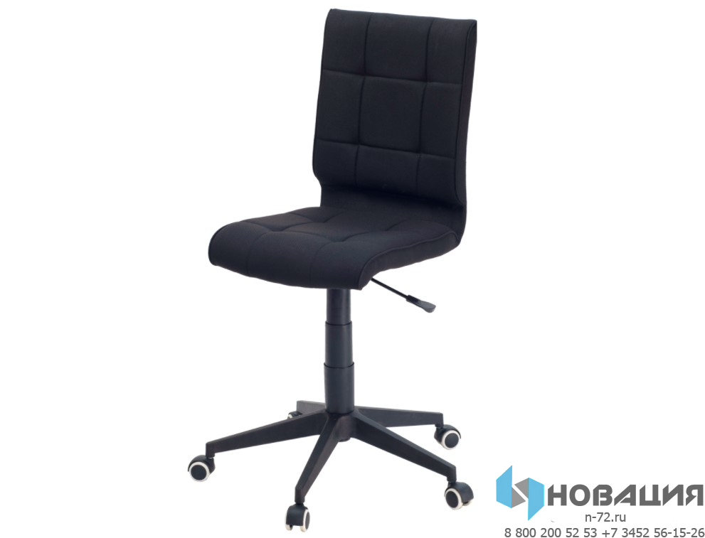 Кресло без подлокотников стоит на пятилучье с колесами. Высота меняется. Спинка и сиденье мягкие. Обивка прошита для распределения веса. Передний край посадочного места изогнут.