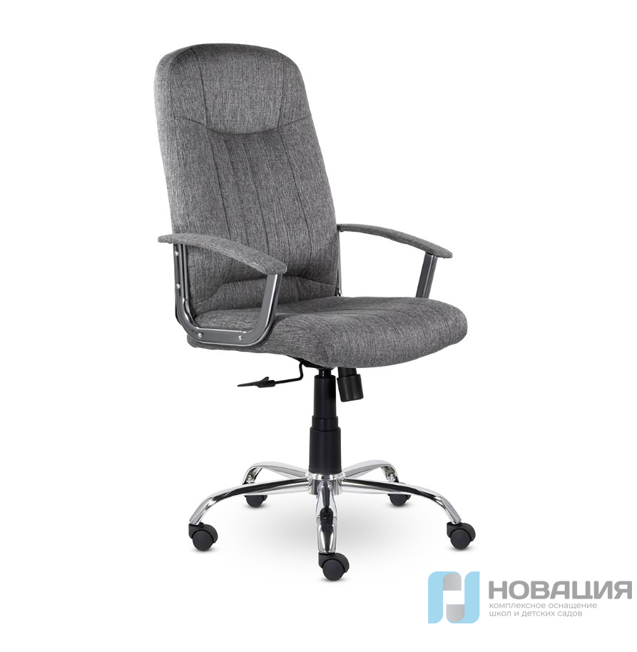 Кресло размещается на пятилучье с роликами. Мягкое сиденье отличается повышенной толщиной и глубиной. Горизонтальные прострочки отделяют подголовник от основной части спинки. Предусмотрены длинные подлокотники для комфортного размещения.