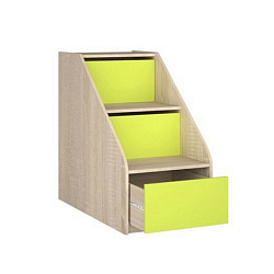 В кровати с тумбой ярусы, расположенные друг над другом, доступны для детей благодаря специальным вырезам, боковым ступенькам. Над 3-м ярусом находится полка, имеющая бортики с 3-х сторон. Углы бортиков, как и боковых элементов ложа, скруглены. Вместе с массивными боковыми опорами отсек для хранения составляет тумбу.
