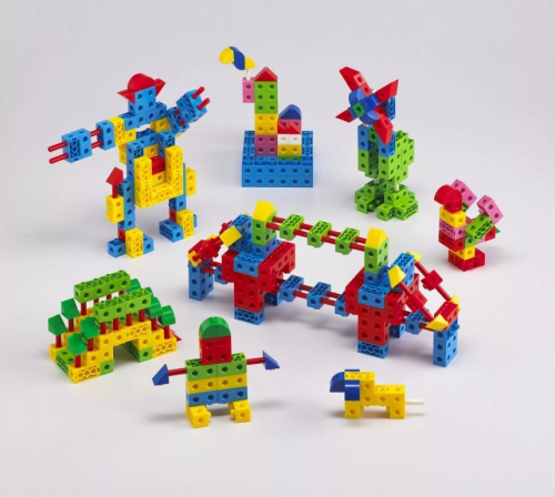 Поставляется в пластиковом контейнере. В процессе игры дети вставляют шипы одних деталей в отверстия других, строя различные модели. Занятия с конструктором помогут в развитии творческих способностей, мелкой моторики, навыков счета и сортировки.