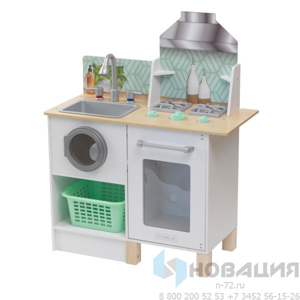 На рабочей поверхности кухни расположена варочная поверхность с двумя конфорками и раковина с краном. В нижней части конструкции находятся духовой шкаф и стиральная машина с корзинкой для белья и полочкой. Дверцы техники открываются, ручки поворачиваются и издают звук щелчка. Кухня подойдёт для сюжетно-ролевых игр, стимулирующих развитие фантазии и творческого мышления.