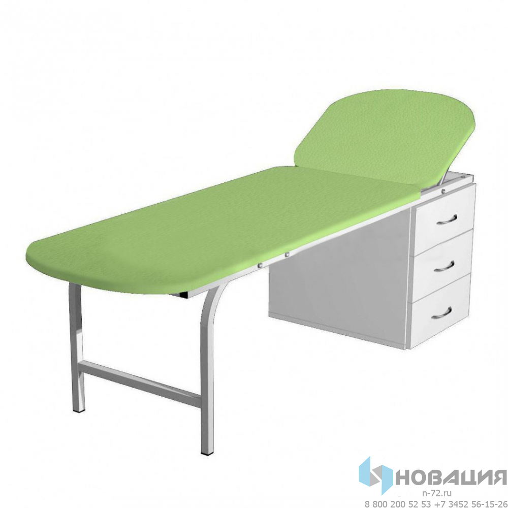 Конструкция состоит из каркаса на профильной трубе, ложа с подголовником и встроенной тумбы с тремя ящиками. Кушетка рассчитана на нагрузку в пределах 120 кг. Подголовник регулируется с углом наклона от 0 до 45°.