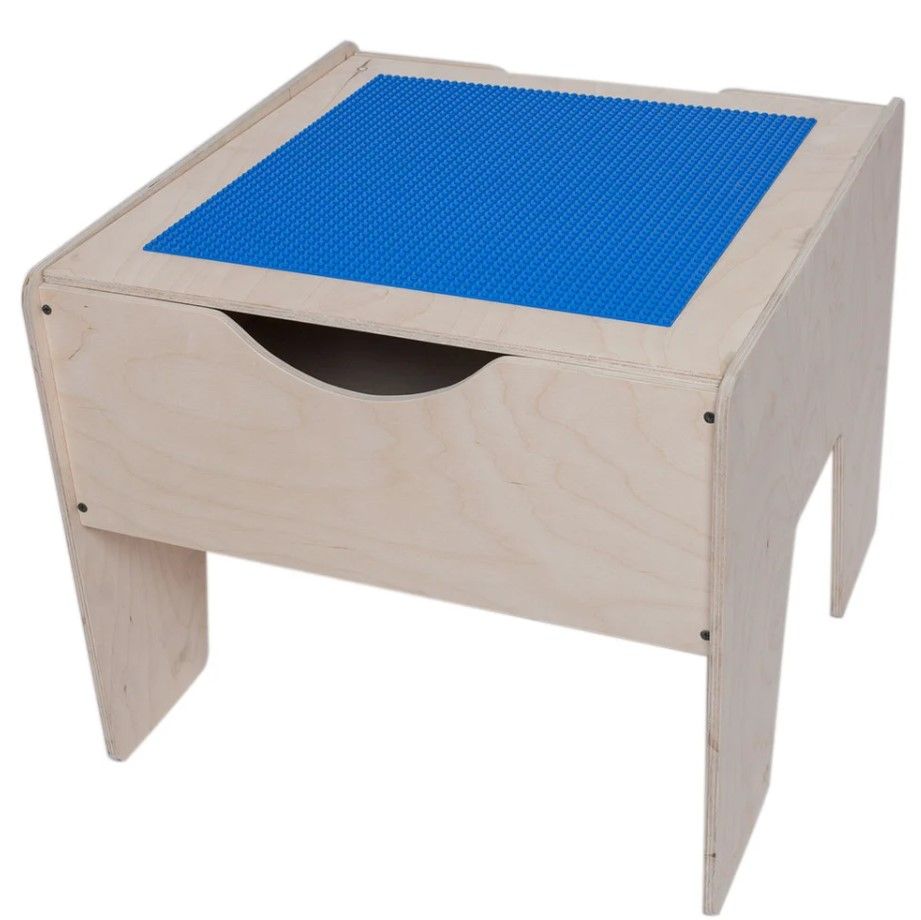 Детали хранятся внутри кубика, верхнее полотно служит рабочим полем. На крышке можно собирать конструктор, лепить, обучаться письму и чтению. Это легкая конструкция для крупных и мелких элементов.