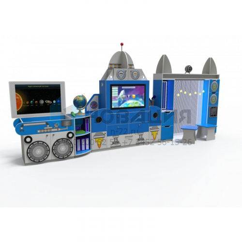 Оборудование подходит для речевых занятий, песочной терапии, знакомства с темой космоса. ПО сертифицировано. Есть индукционная система на подставке. Корпус оснащен разъемом USB A-B, кнопкой включения 220 В, ключом Switch. Экран считывает 10 одновременных касаний. Уровень громкости звука и тембра меняется. Стенка с полками и ящиками оформлена в виде космодрома.