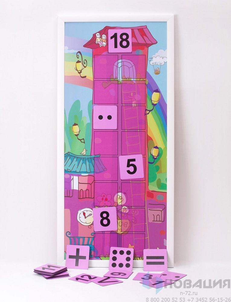 Оформлена в виде домика с окошками, в которых можно размещать карточки. Занятия с использованием доски помогут в игровой освоить арифметические действия, изучить первый и второй десяток чисел.