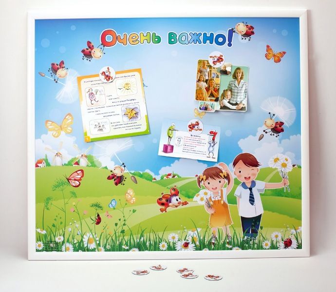 В комплект входит 30 гибких магнитов с изображением бабочек и божьих коровок, которые предназначены для крепления объявлений, информационных листков и плакатов для родителей и детей. Доска легко отмывается от загрязнений простой теплой водой.
