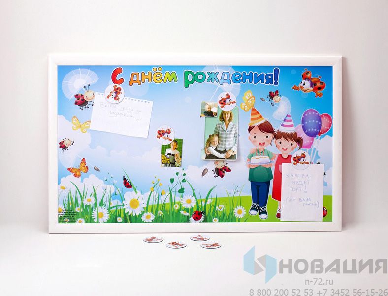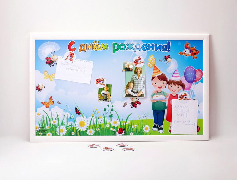 В комплект входят доска и 15 гибких магнитов с изображением бабочек и божьих коровок, которые предназначены для крепления поздравительных открыток, плакатов, фотографий и списков именинников.