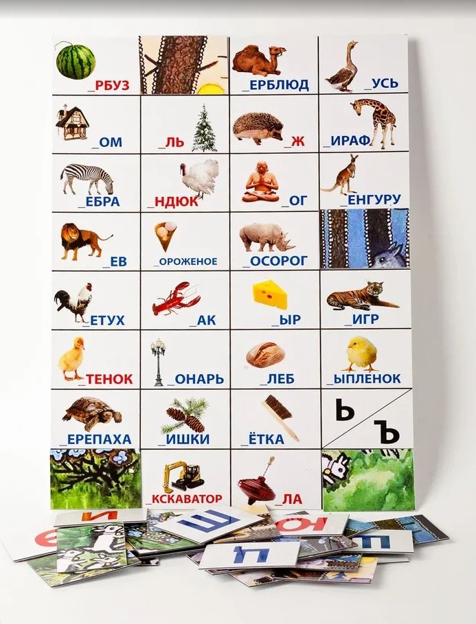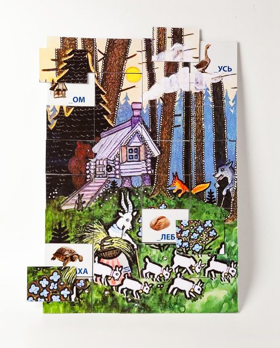 На одной части карточек изображены различные животные и предметы, на другой - написаны буквы. Изображения на карточках подписаны, но в каждой подписи не хватает первой буквы, которую дети должны выбрать среди карточек с буквами и вставить в игровое поле. Если все карточки будут подобраны правильно, то с обратной стороны поля получится иллюстрация к сказке «Волк и семеро козлят».