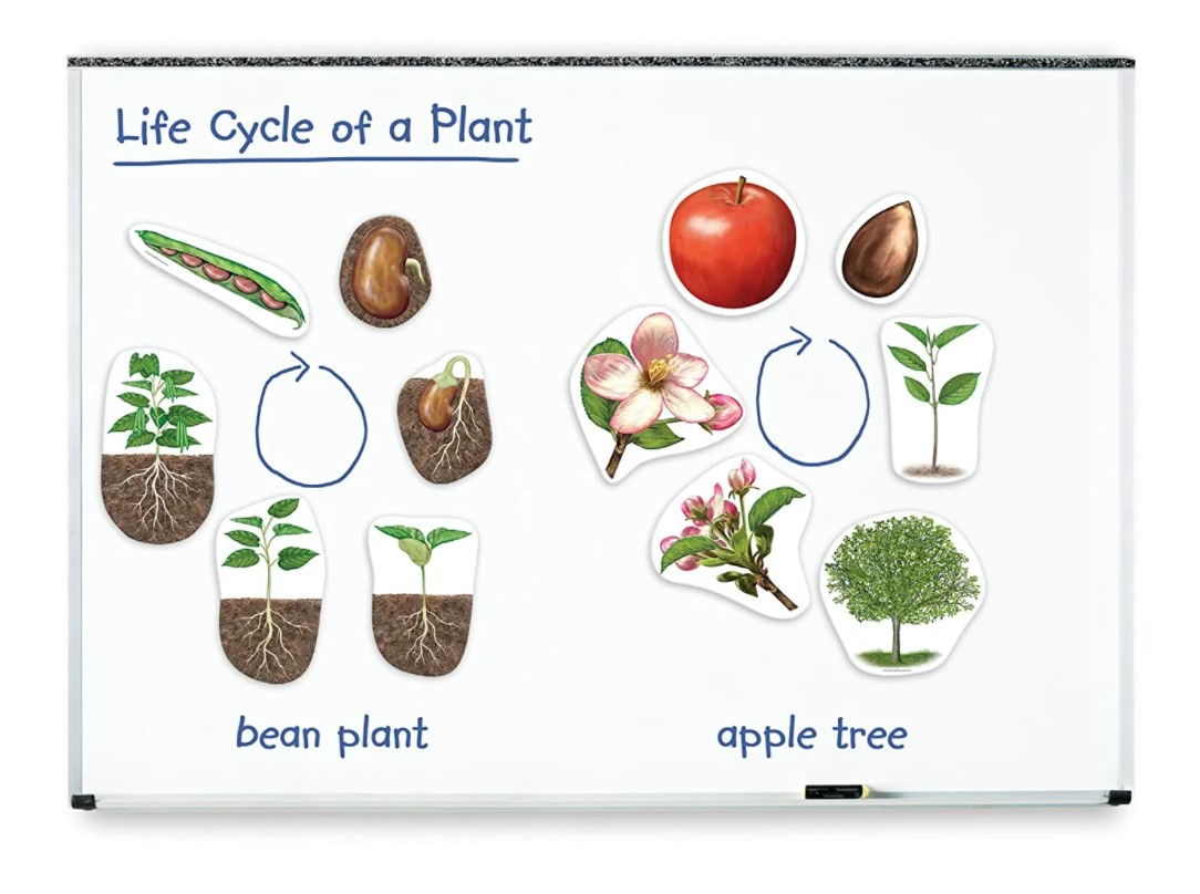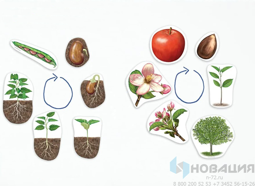 Набор иллюстративного материала позволяет проследить за развитием 2-х видов растений: бобовые и яблоня. На крупных магнитах для доски изображены стадии роста, созревания.