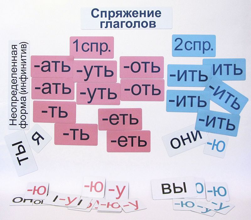 Предназначен для изучения спряжения глаголов. Карточки для двух спряжений отличаются по цвету. С использованием набора можно выполнять задания на доске, проводить различные игры в рамках урока.