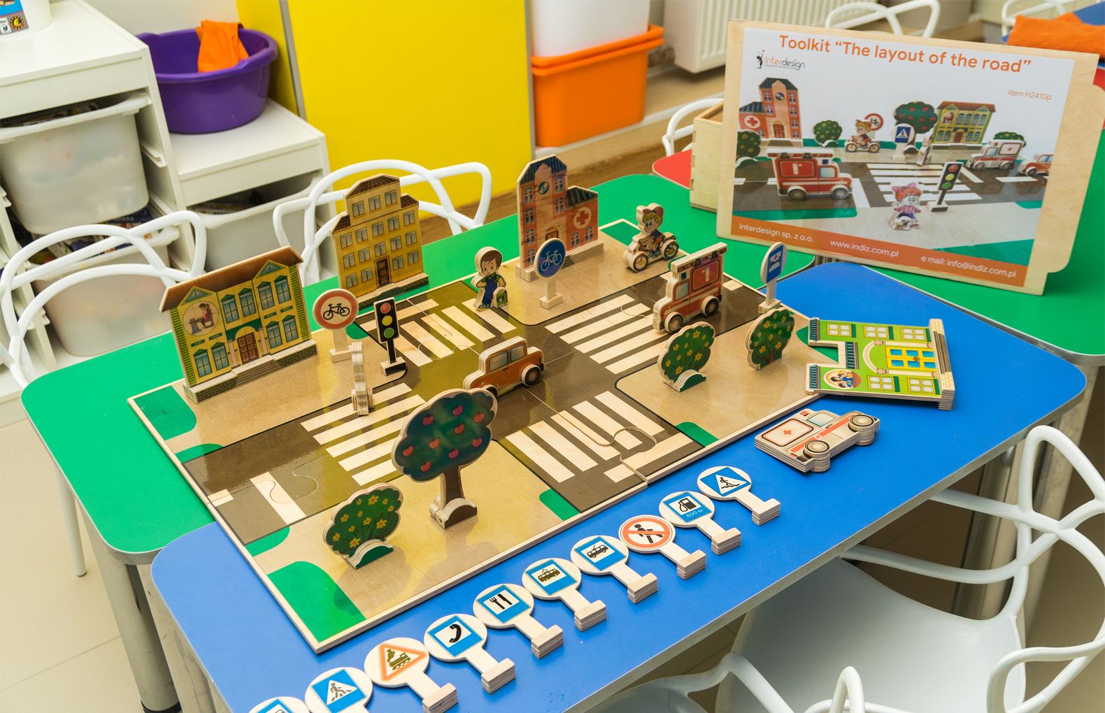 Макет представлен 2-сторонним полем с имитацией дороги и вспомогательными элементами. В комплекте устойчивые фигурки пешеходов и регулировщика, светофоров, машин (карета скорой помощи, пожарный и легковой автомобили), дорожных знаков, домов, деревьев, учреждений (детский сад, больница, школа). Набор воссоздает городскую инфраструктуру и помогает заучить правила поведения на улице. Основой для поля служит баннерное полотно.
