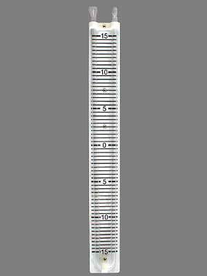 U-образная трубка и стекла монтируются к пластине со шкалой. Деления расположены через 5 мм, нулевое значение в центре. Прибор фиксируется вкручиванием винта в скобу на обратной стороне штатива.