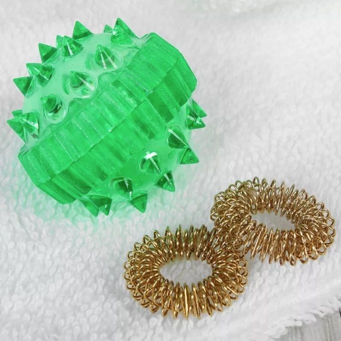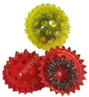Представляет собой мяч с шипами из пластика, внутри которого находится массажер для пальцев рук. Шарики су-джок активно применяются в практике логопеда для массажа детских рук и пальчиков. Массаж рук стимулирует речевую активность ребенка.