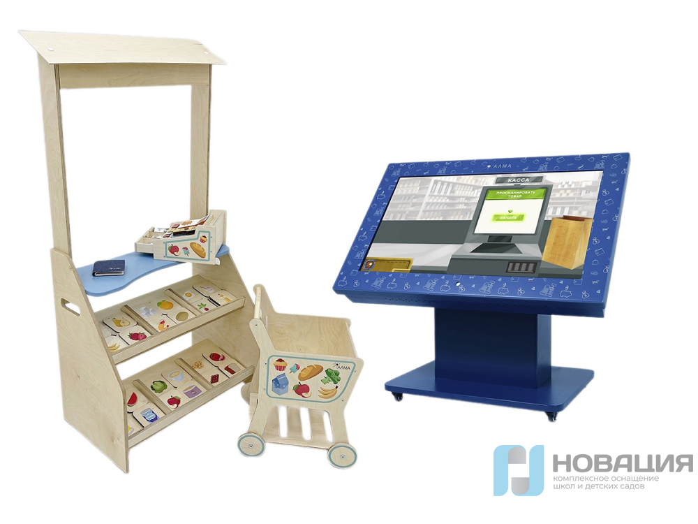 - Дополнительная атрибутика «Магазин» (касса, тележка, продукты, макеты денег и пластиковых карт, копилки, кошельки);