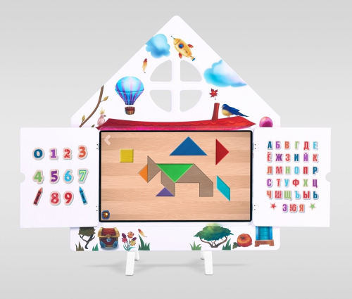 Художественно оформленная в виде теремка панель имеет створки, которые защищают от повреждений поверхность экрана. На них также нанесен принт с алфавитом и цифрами.