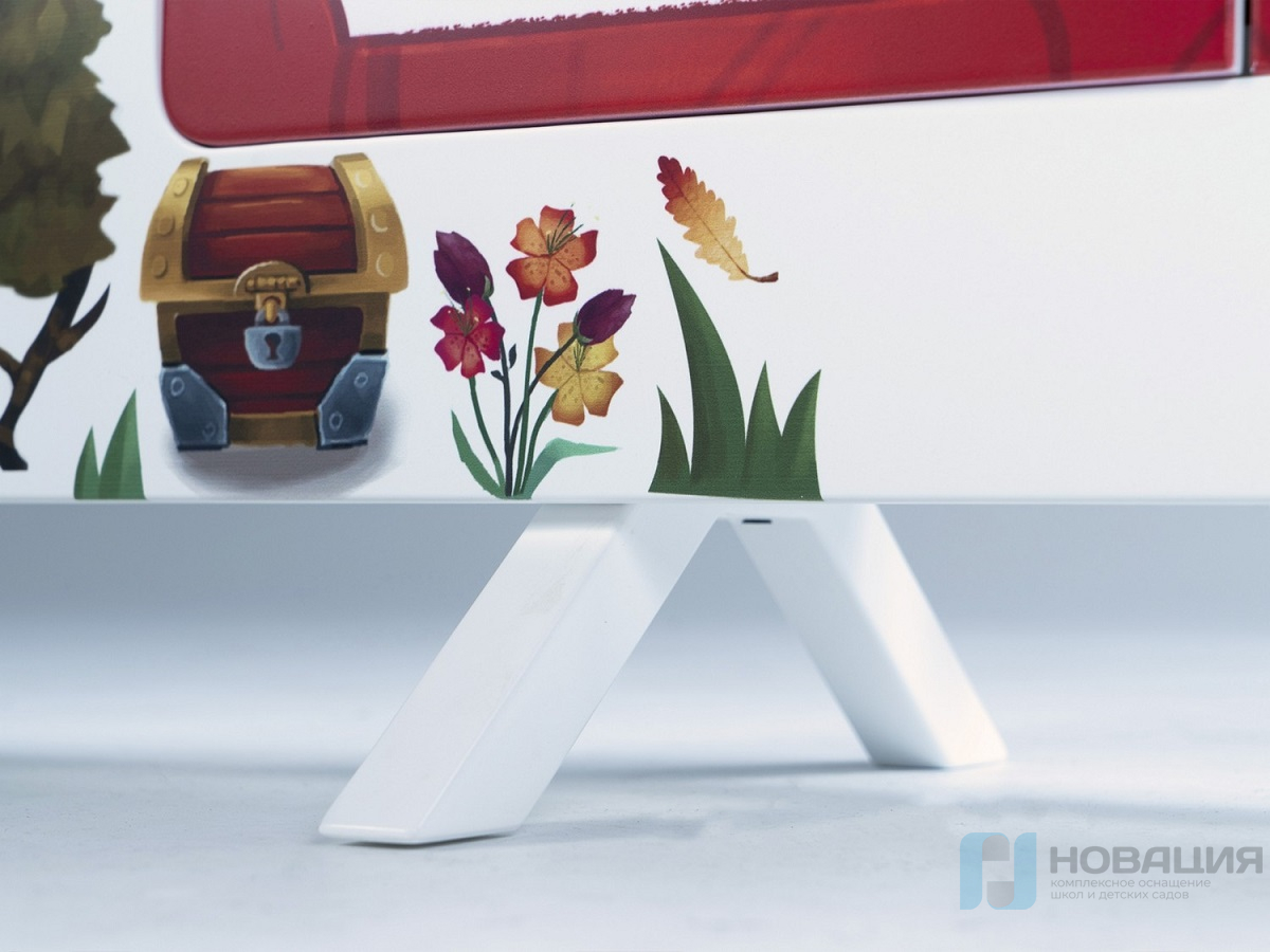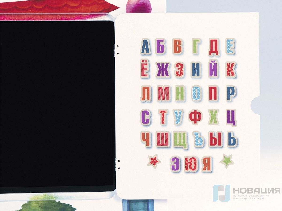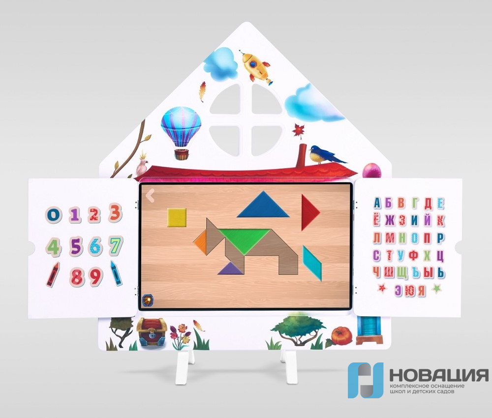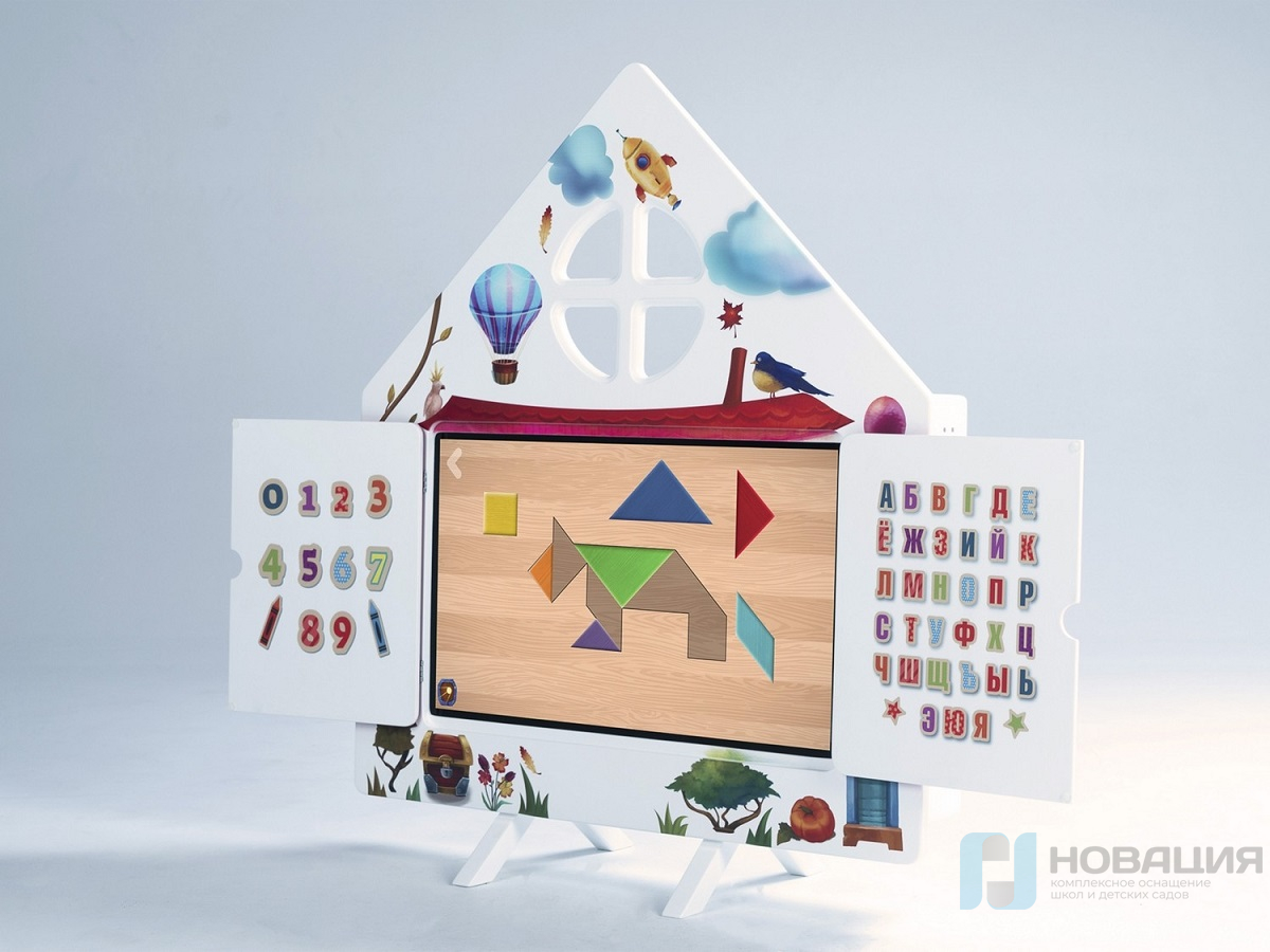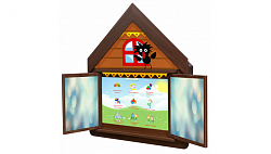 - Интерактивная настенная панель в виде теремка со ставнями, на которых нарисованы буквы и цифры (25 дюймов, Full HD, мультитач 10 касаний);