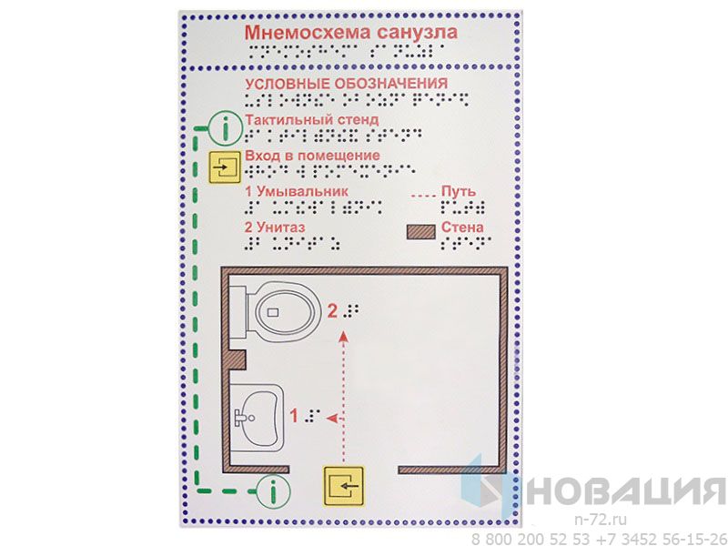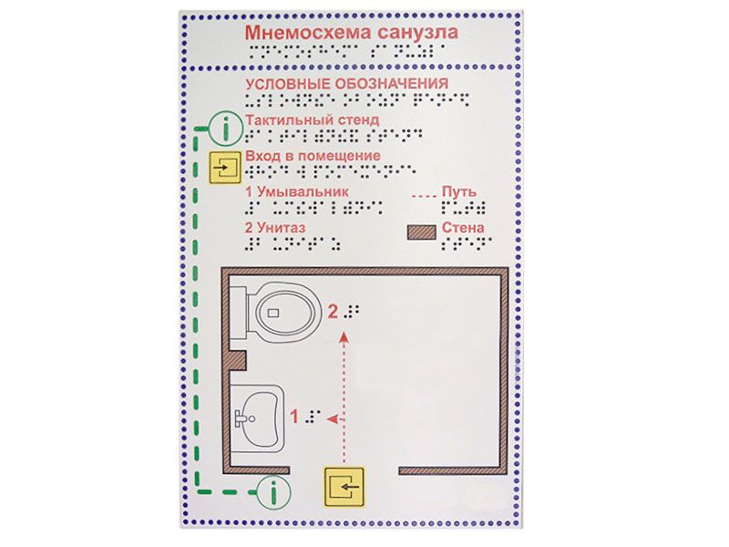 Мнемосхема крепится при помощи саморезов или 2-стороннего скотча. Изображение плана санузла сопровождается пояснительными надписями. Тактильный шрифт из отверждаемой краски помогает лицам с нарушениями зрения ознакомиться с информацией. Цвет фона соответствует ГОСТу либо обговаривается индивидуально.