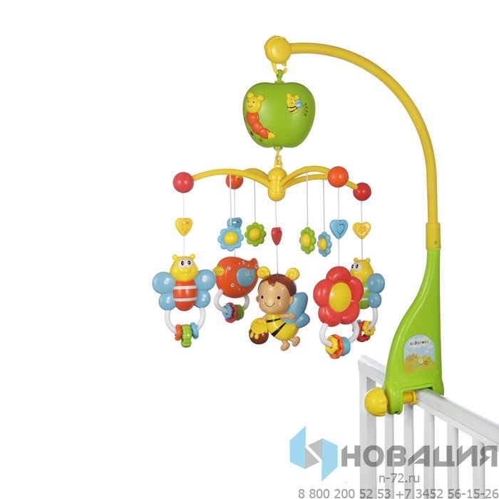 Устройство с заводным механизмом при помощи винта фиксируется над кроваткой ребенка. На подвесах закреплены разноцветные элементы со звуковыми эффектами и безопасным фигурным переключателем. Доступно 18 аудиодорожек. Игрушки оснащаются петельками, которые служат для стимуляции хватательного рефлекса. Мобиль способствует развитию слухового восприятия, зрительной и музыкальной памяти, цветоразличения.