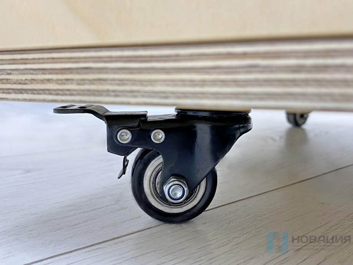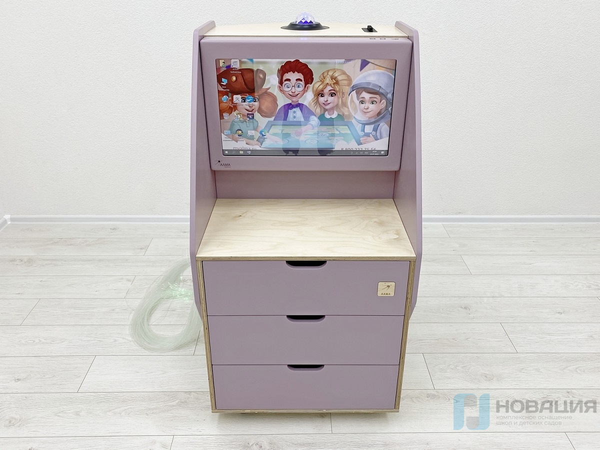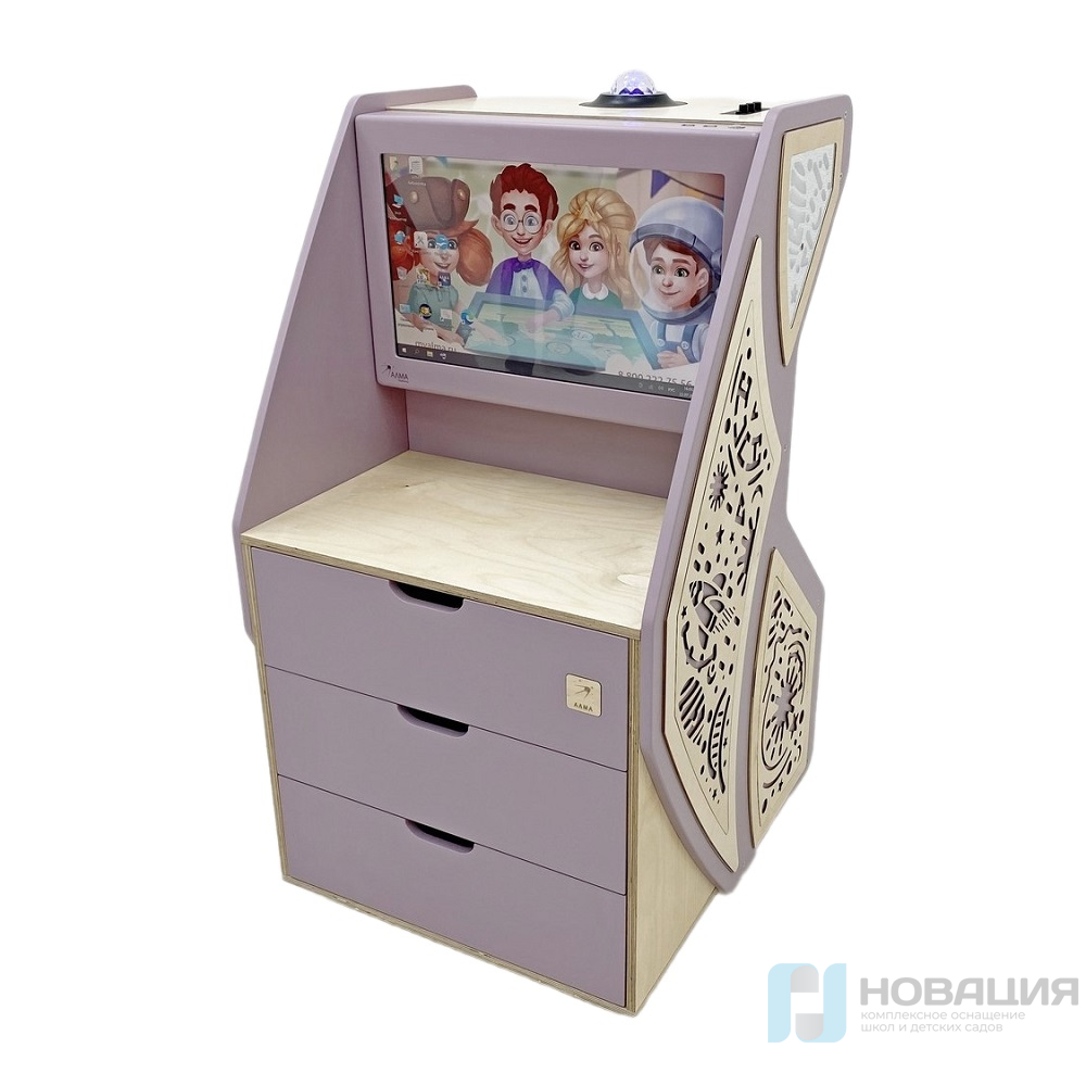 С обратной стороны комплекса располагается интерактивная сенсорная панель с установленным ПО. Под панелью есть 3 ящика для игрушек.