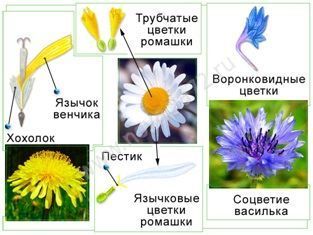 - Отдельные цветки соцветий подсолнечника и василька.