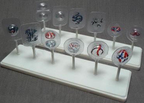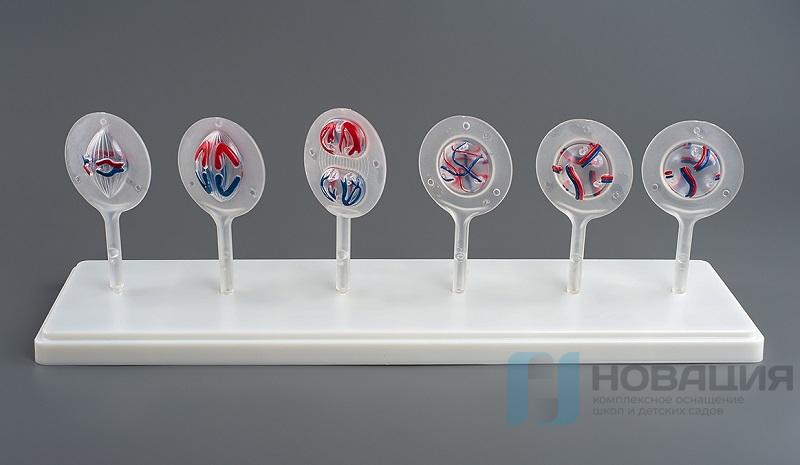 Другая часть из 6 моделей клеток отражает первое деление мейоза. Красным и синим цветами выделены гомологичные хромосомы.