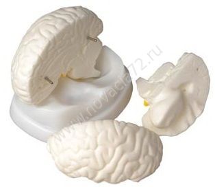 Модель является разборной, изображает внешнее строение головного мозга человека и его сагиттальный разрез. Желтым цветом выделены нервные пучки.