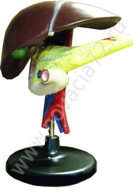 Модель на пластмассовой подставке состоит из 3-х частей. Демонстрирует особенности внешнего и внутреннего строения печени.