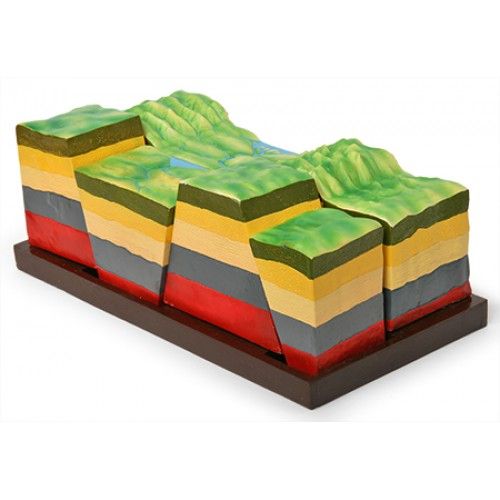 Одна из частей модели представляет собой участок земной коры с рельефом, который возник в результате таких тектонических явлений, как сбросы и сдвиги. Другая часть состоит из 4-х отдельных блоков и позволяет рассмотреть, как происходит процесс сбросо-сдвигов.