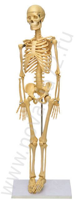 Модель на пластмассовой подставке изображает строение человеческого скелета. Позволяет рассмотреть следующие части: