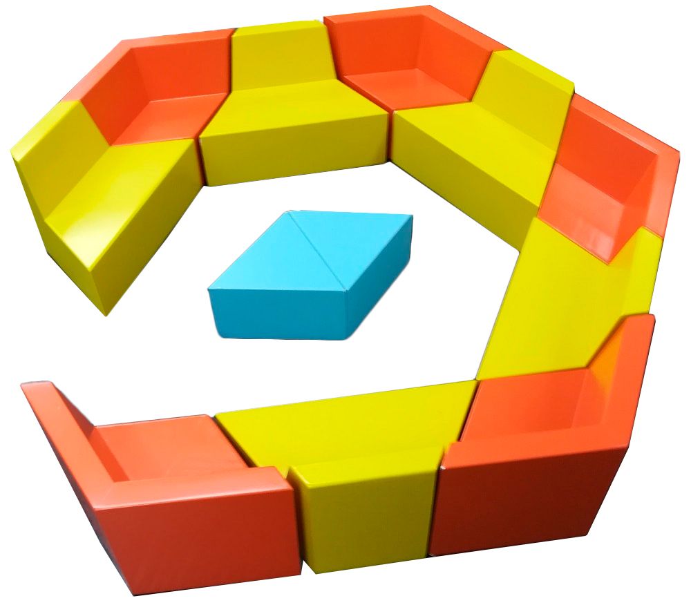 Отдельные секции плотно стыкуются друг с другом, образуя вместительный модульный диван с имитированием столика в центре. Такой предмет мебели оптимально подойдет при проведении групповых занятий с детьми.