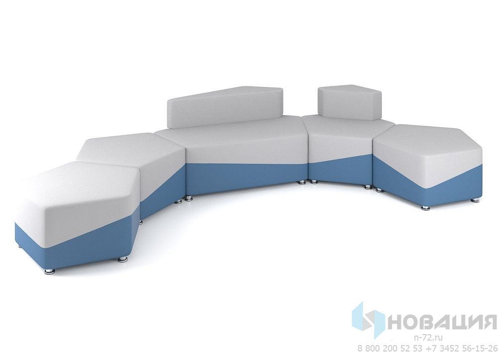 Мебель составляется из 2-цветных пуфов со спинками и без, доступ к дивану обеспечивается с обеих сторон. Элементы дивана расставляются произвольно, что удобно для зон отдыха и переодевания.