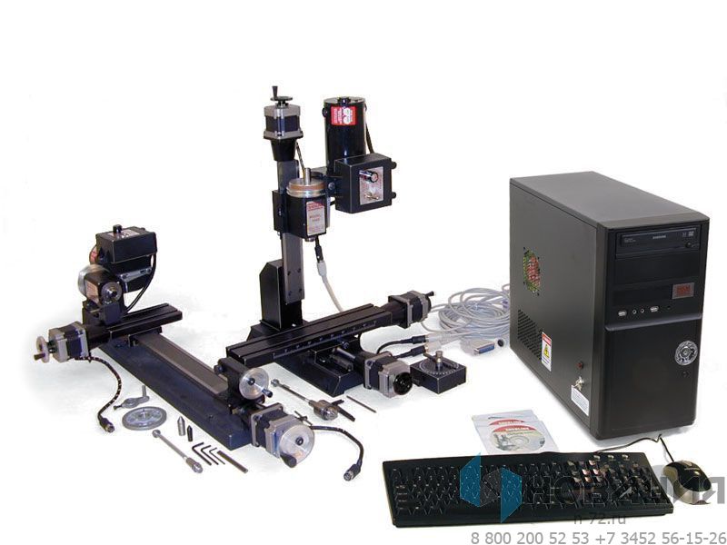 - Комплект А: тиски, комплект цанг (3 шт.), сверлильный патрон для конуса Морзе 1, комплект центровочных сверл (3 шт.), инструмент с одним лезвием для обработки плоских поверхностей, 6 двусторонних концевых фрез и державка, набор крепежа для заготовок, шестигранник с Т-ручкой (4 мм).