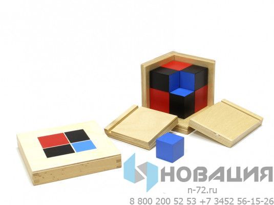 Из элементов набора на занятиях по методу Монтессори можно собрать биномиальный куб. Грани одного цвета ребенок прикладывает друг к другу. Чтобы получить исходную фигуру, необходимо сравнить размеры деталей. На занятиях демонстрируется принцип алгебраической формулы (квадрат двух слагаемых).